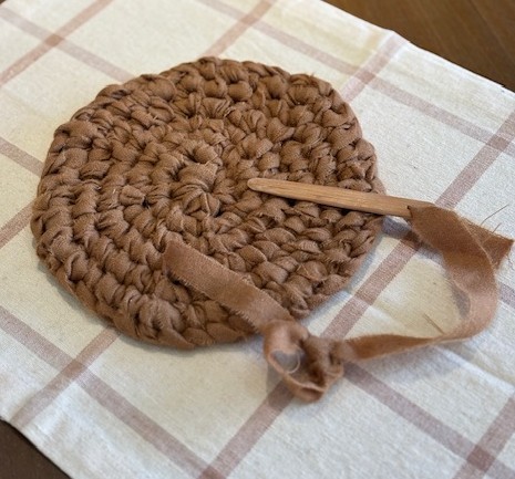 生地を裂いて専用の針で編みます。編み物のように目が揃わなくてもOK!!一度編み方を覚えてしまえば、丸、楕円、大、小。。。いろいろな大きさと形で作れるようになります。 やり方がわかれば、応用がきくものですので、お手持ちの布で色々作ってみてください。